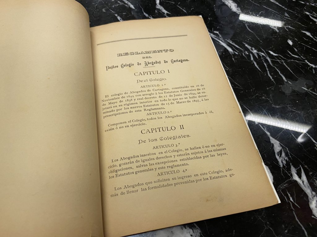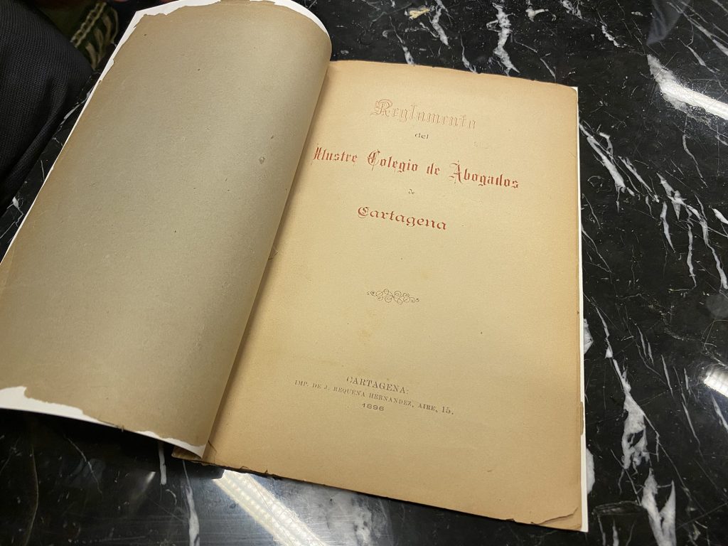 Y es que en la mañana de ayer, este colegiado, gran aficionado a los libros históricos, hizo entrega al Decano, Antonio Navarro Selfa y al Bibliotecario-Contador, Carlos José Martínez Martínez, de un ejemplar en un sorprendente buen estado de conservación del Reglamento de nuestro Ilustre Colegio de Abogados de Cartagena del año 1896, siendo Decano D. Ángel Moreno Martínez y que desarrollaba los Estatutos del año 1895, y que pasará a engrosar el patrimonio histórico-bibliográfico del Colegio.
